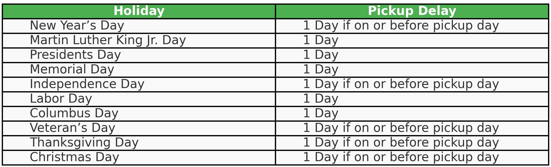 If the holiday falls on your pick-up day, please note a one-day delay in service.